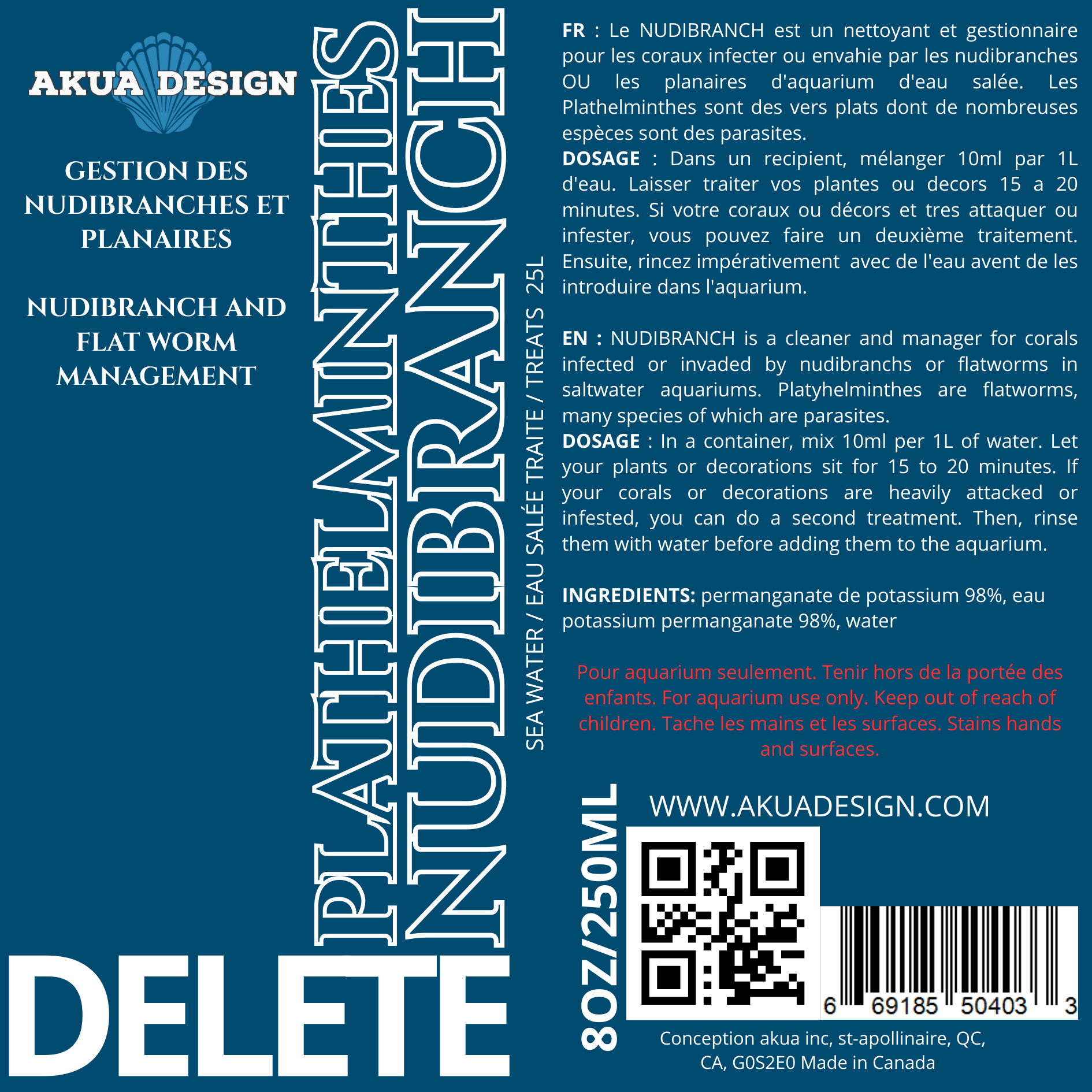 Plathelminthes Nudibranch – Delete Akua Design est la solution rapide et efficace contre les nudibranches, planaires et vers plats qui envahissent les coraux et décors d’aquarium d’eau salée. Idéal pour un traitement préventif ou curatif, il agit en 15 à 20 minutes tout en préservant le reste de l’écosystème.